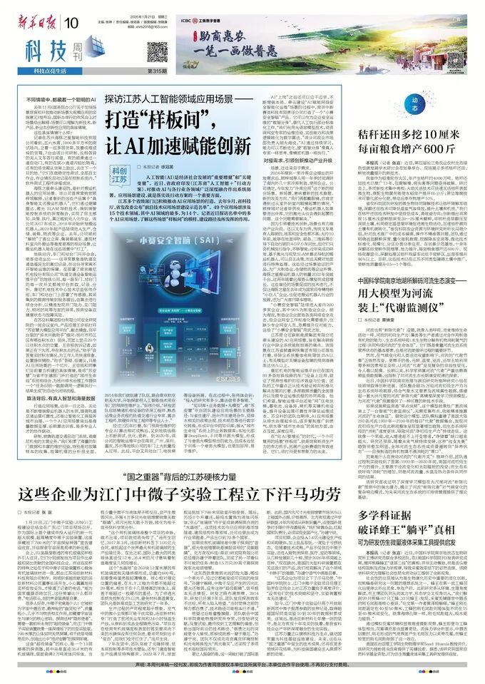 2026年1月21日,《新华日报》以《探访江苏人工智能领域应用场景——打造“样板间”, 让AI加速赋能创新》为题,报道了yabo.com等入选江苏省“前沿技术应用场景建设示范名单”企业,在应用场景建设方面的实践与成效。